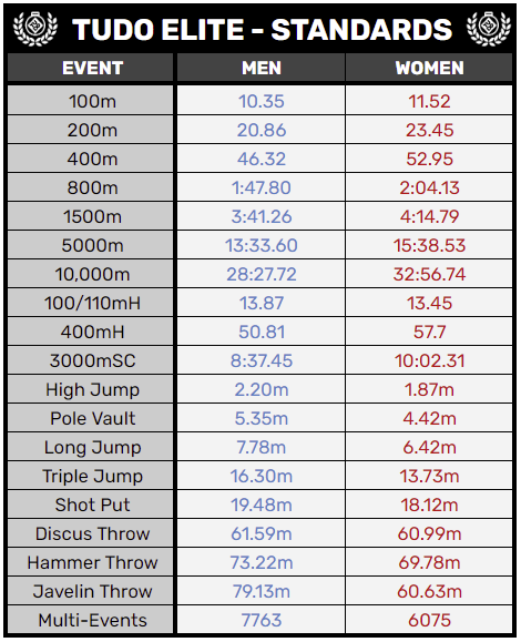 If you have attained these standards in your respective event either this year or in 2021. Then we’d love for you to reach out to us! Simply send anĀ email info@tudosport.com with your name, event, personal and seasons best and any additional information you wish to provide!